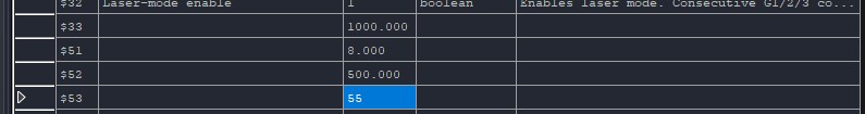 I ran into an issue where the machine was stopping due to tilt angle and shock and movement errors being thrown. For hours I troubleshot both LaserGRBL and the machine, with no success. On a whim, I modified setting $53 in LaserGRBL, which is proprietary to Roomark's Laser Engraver. The value must be a multiple of 5, and 55 or more. It relates to its detection of tilt angle.