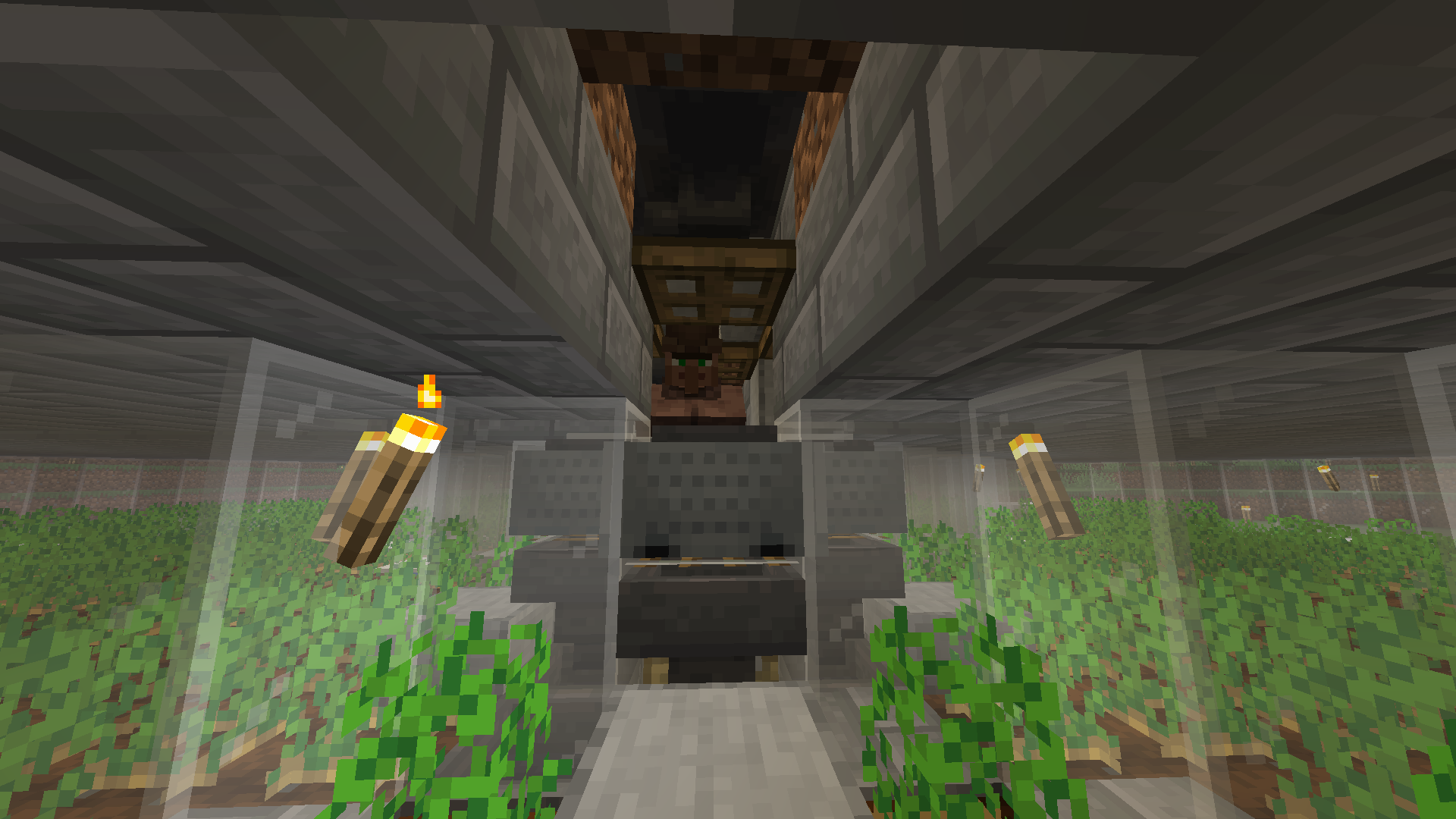 The middle villager does not pick up any potatoes thrown at him. Instead, the hoppers underneath him pick up the potatoes and filter through the storage system. Hoppers extend to the side and all merge into a single lane, and eventually rotten potatoes are sorted out and thrown into lava.